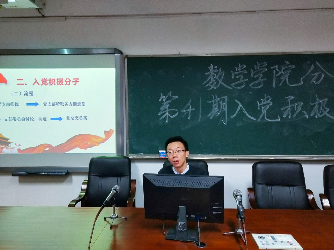 本站讯 10月28日19:30于5511,数学学院分党校开展第41期入党积极分子培训(四)。第41期入党积极分子全体人员参加。此次培训由数学学院学生党支部书记,何铁勇同志主讲。