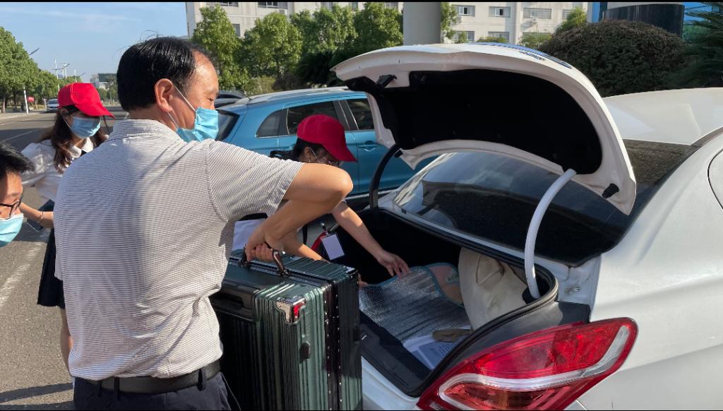 早上6:40四支部党员志愿者于五栋教学楼前进行合照,然后按照时间安排表分批次进行志愿服务活动。由于疫情的原因,家长将新生送至校门口后,便由志愿者们接过家长们的“接力棒”,他们为新生提行李,帮助新生熟悉校园。他们用自己的热情为新生们的大学生活写下充满温暖的第一笔。