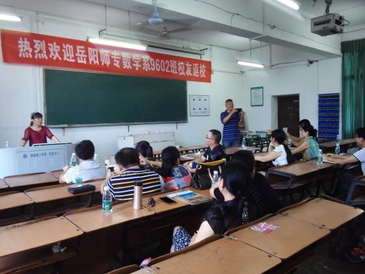 2016年8月8日下午14:30,于1号教学楼1415教室数学学院96级02班校友齐集一堂。原岳阳师专数学系教师毕冬娇参加座谈。