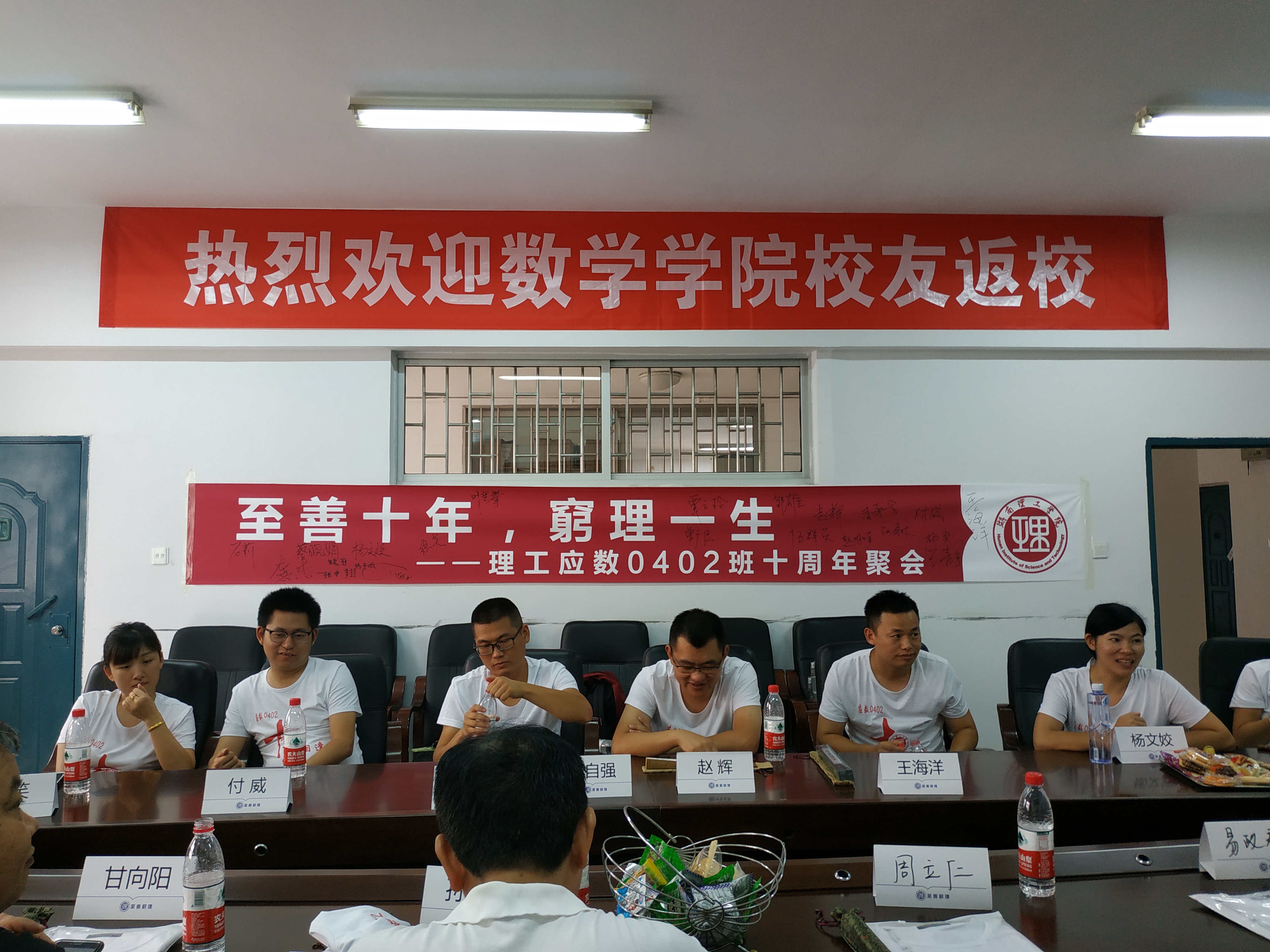 2018年7月28日上午9:00,数学学院2004级2班于5306举行毕业十周年座谈会。数学学院院长孙明保,党总支书记甘向阳,副院长周立仁,副院长丁卫平,党总支副书记易政群,原2004级辅导员杨慧荣出席。数学学院2004级2班校友参加座谈会。