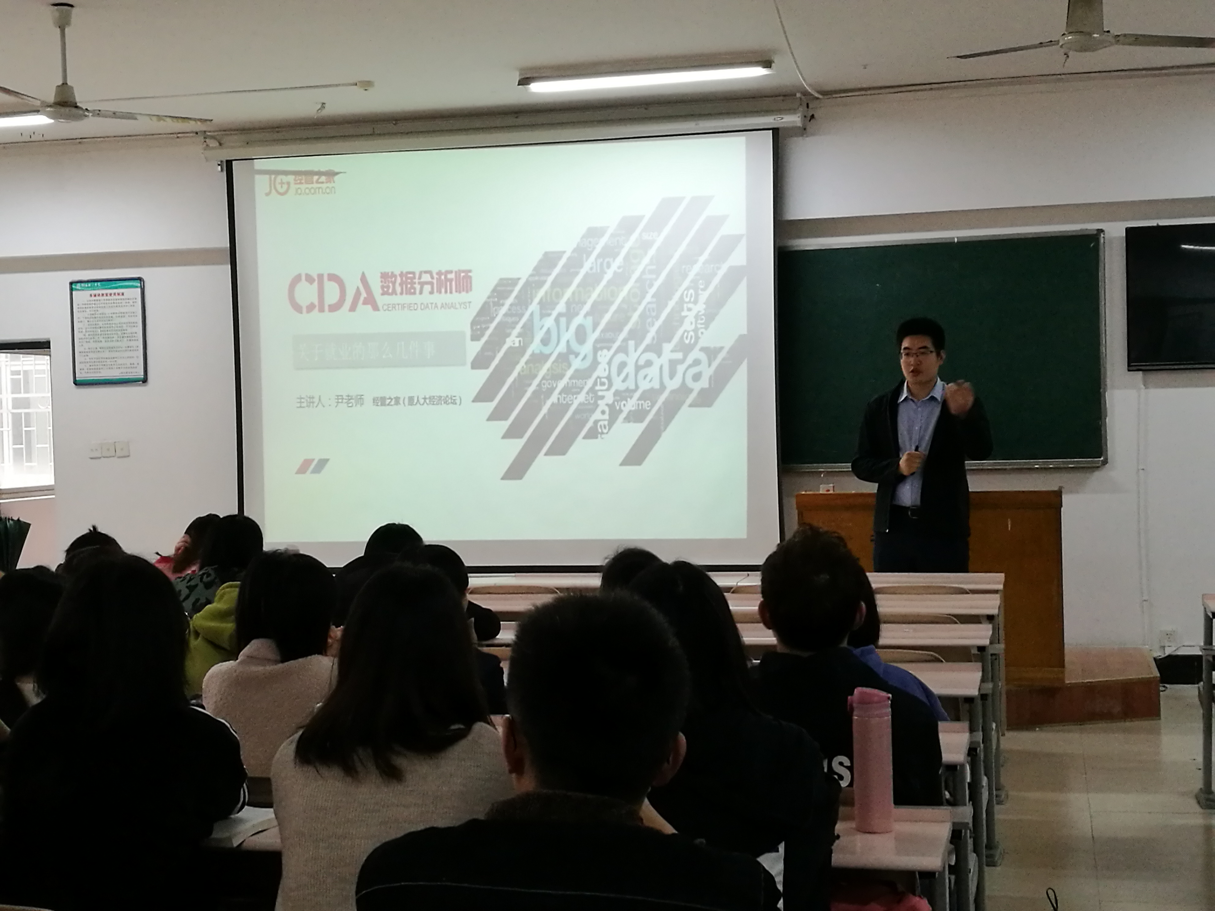 4月3日上午10点在5308教室,针对信息与计算科学专业数据统计分析方向发展,邀请经管之家校企合作总监尹其斐先生来我院讲学,就数据分析行业发展从以下几个方面进行介绍。