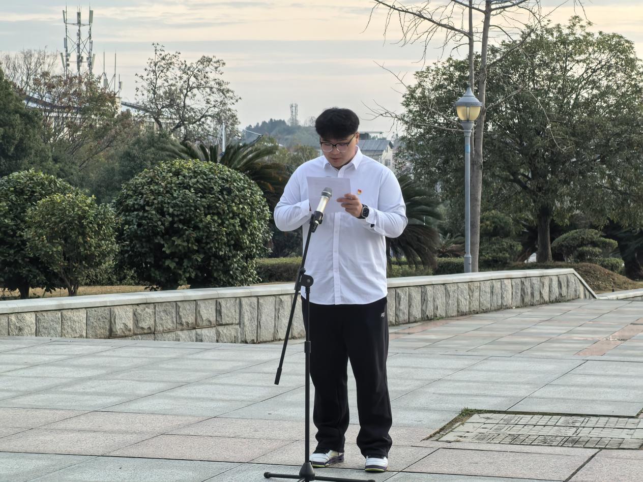 升旗仪式结束后,23级学生代表刘崇浩以《以青春赴使命,以行动写担当》为题发表演讲。他回顾了不同时代青年的责任与担当,分享了湖理学子在无偿献血、志愿服务等实践活动中的暖心事迹。他呼吁全体青年学子,要立足专业所长,以知识服务社会、以实践锤炼品德,深刻践行“至善穷理”的校训精神,用青春行动书写责任担当,助力民族复兴伟业。
