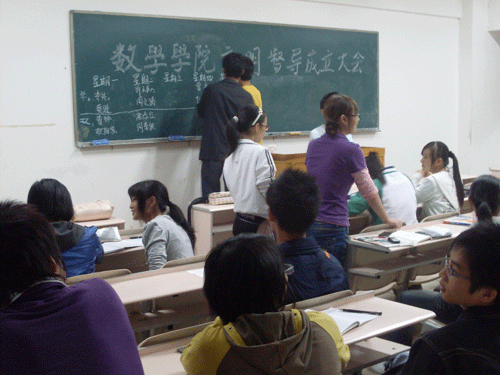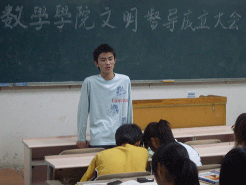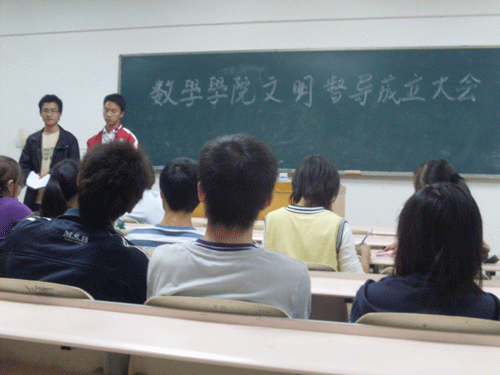 为营造良好的校园文明氛围,进一步完善班级常规工作和学生行为习惯的检查,数学学院于10月22日晚在5301召开文明督察大会。该院团总支学生副书记杨耀酬、学生会副主席王成、生活部干事及08、09级督察员参加此次会议。会议由学生会生活部部长孙奇兵主持。