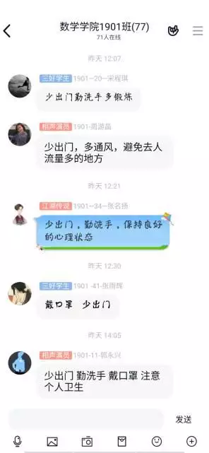 在总结讨论过程中,同学们积极发言,表达自己的想法,及时提出自己的疑虑。面对一些错误做法立马纠正,还会列举一些相关实例,分享自己看到过的视频。虽然此次活动是在线上开展,但同学们丝毫没有敷衍了事。显然,在疫情面前,每个人的态度都是坚决的,坚决做好防疫工作,拒绝成为新冠病毒的“下一目标”。