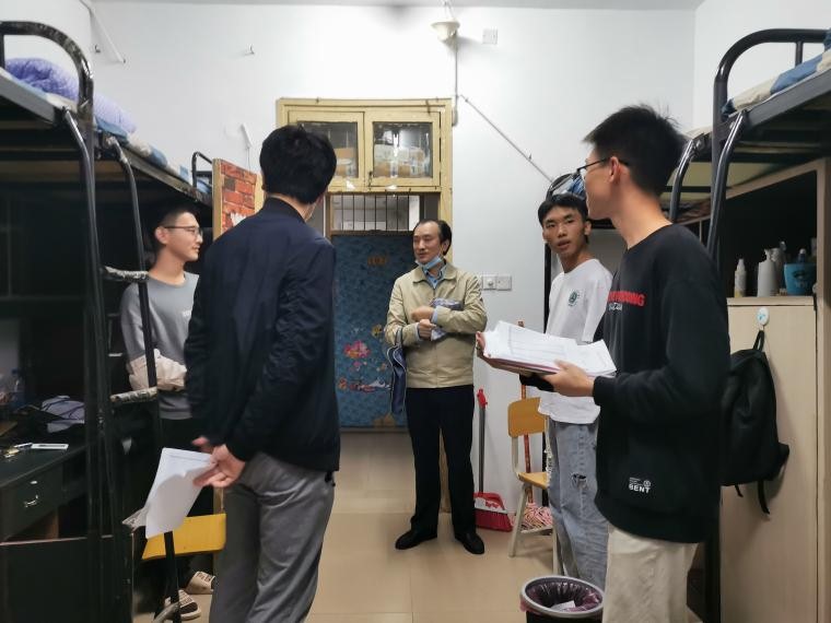 本站讯 为了进一步了解20级新生的宿舍生活情况,同时为了提高学生们的安全意识,9月23日晚,太阳成集团tyc151cc书记孙明保、党委副书记易政群、20级辅导员徐笑天、各班班主任及班主任助理走访了新生寝室。