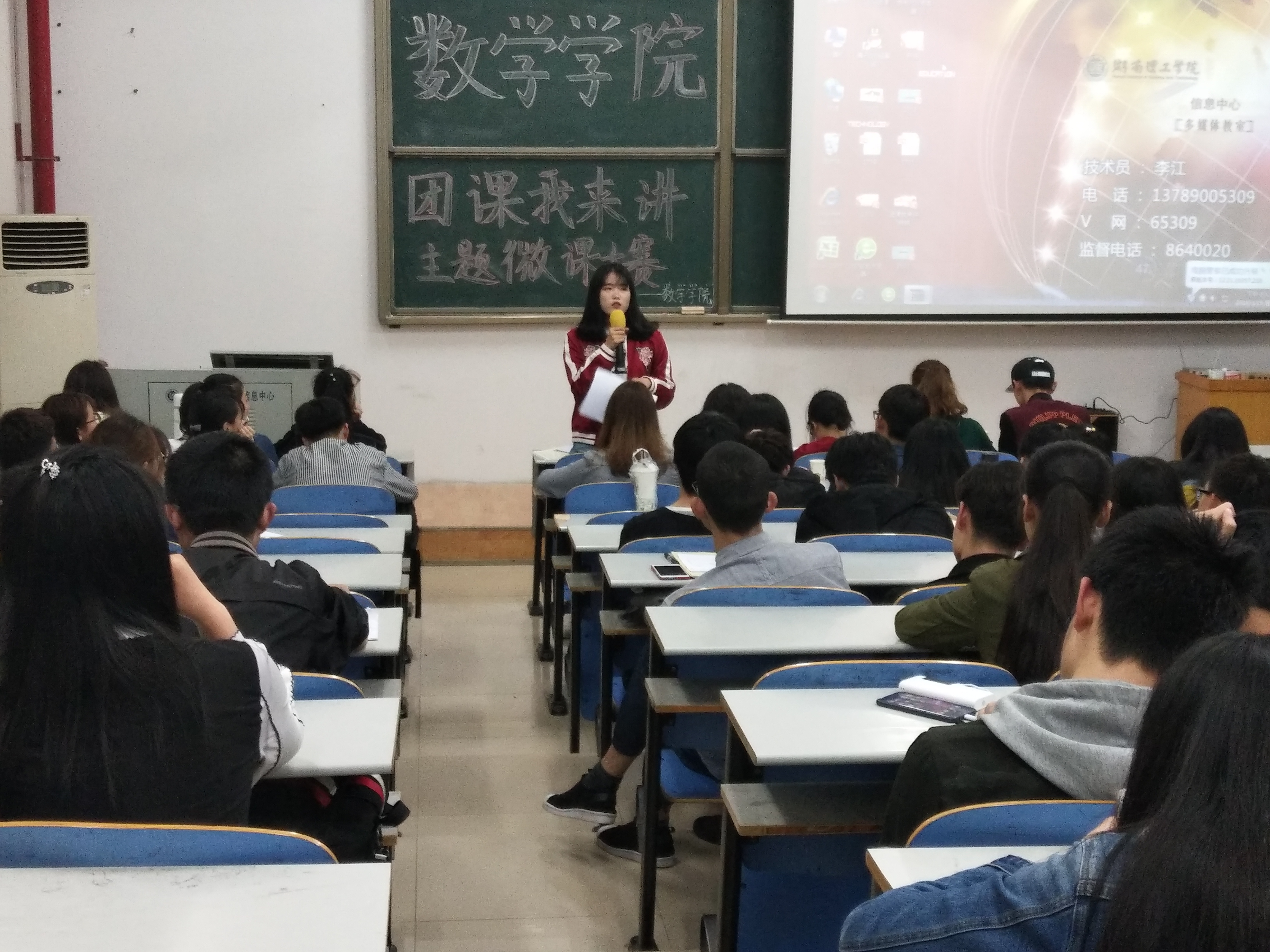 本站讯 3月29日晚,数学学院团学分会于十五栋教学楼15304教室举行“团课我来讲”主题微课大赛。校团委组织部干部以及数学学院团学分会主要干部担任评委,16、17级各班团支书参与。
