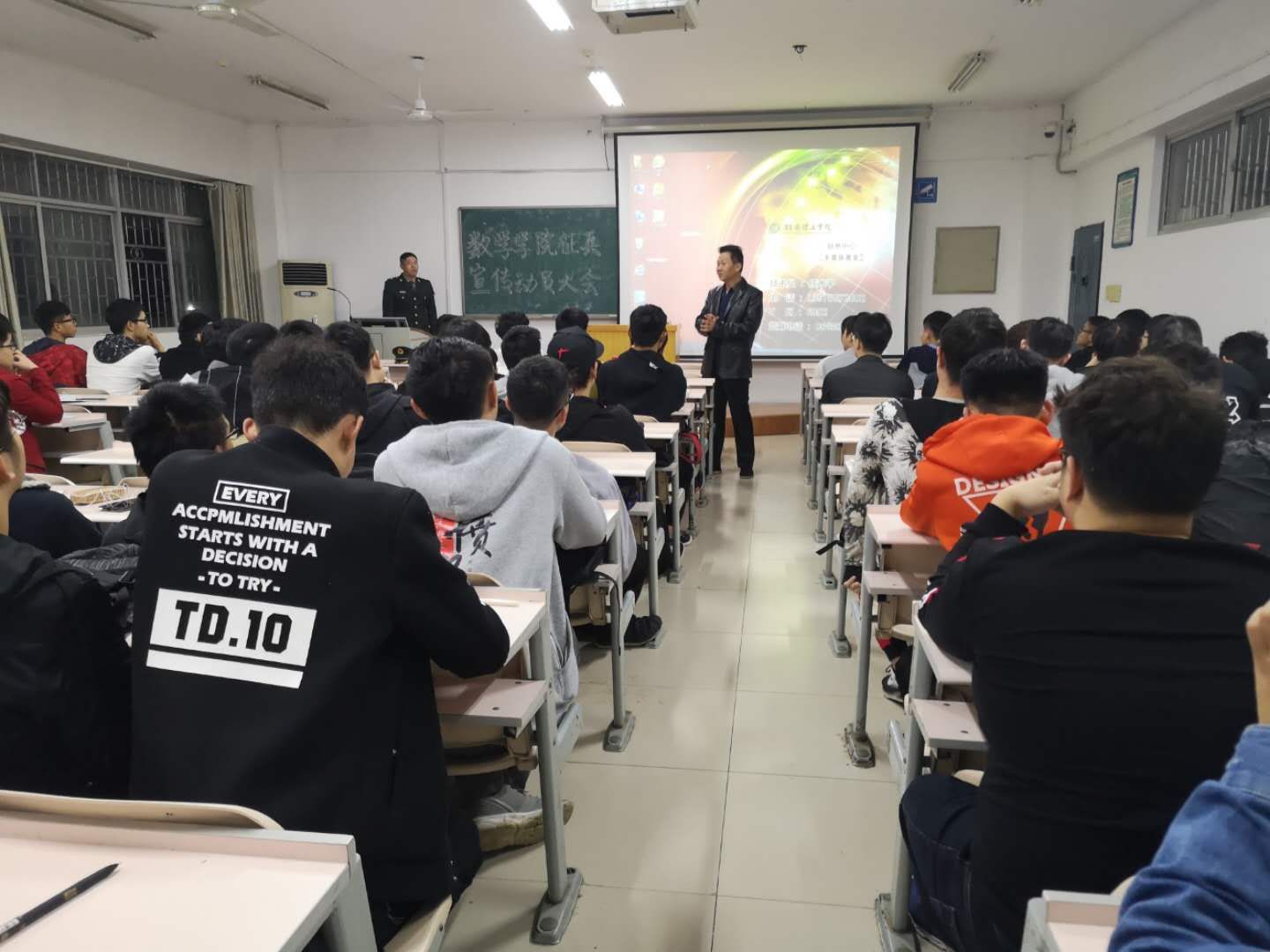 本站讯 4月11日晚上7点,数学学院在5404、5408教室开展了征兵动员大会,数学学院党总支副书记易政群老师,张琰、梅傲寒等部分有参军经验的学姐学长出席会议,17级部分学生代表以及18级全体男生参与会议。