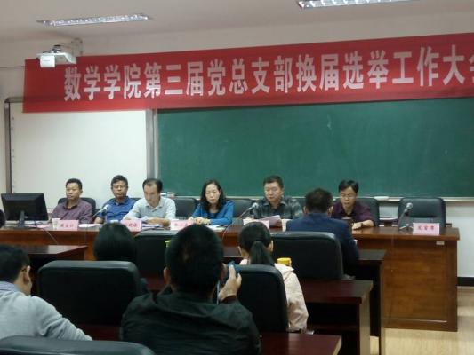 校园网讯 按照校党委对学院党总支委员会换届选举工作的部署和要求,数学学院党总支部于10月11日下午在数学学院学术报告厅5511成功召开学院党总支委员会换届选举党员大会。副校长徐小立到会祝贺并提出殷切希望。学院党总支部全体党员共38人参加会议。大会由数学学院院长孙明保主持。大会在庄严的国歌声中隆重开幕。