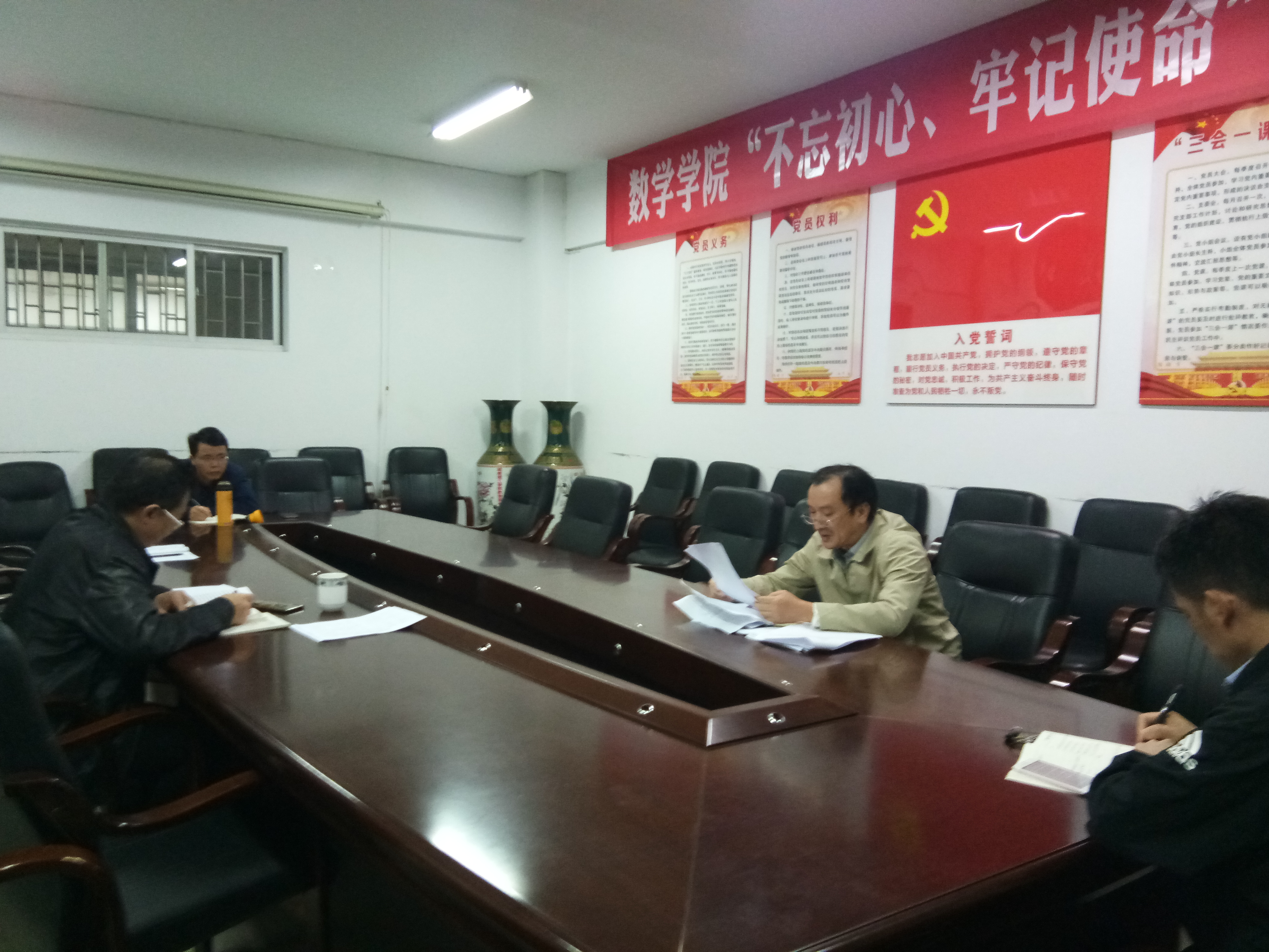 2019年11月12日下午16:30于5306,数学学院党总支召开扩大会暨支部书记第一次例会。学院党总支书记孙明保,副书记江五元,副书记易政群,总支委员李松华出席会议。全体支部书记参加会议。会议由孙明保同志主持。