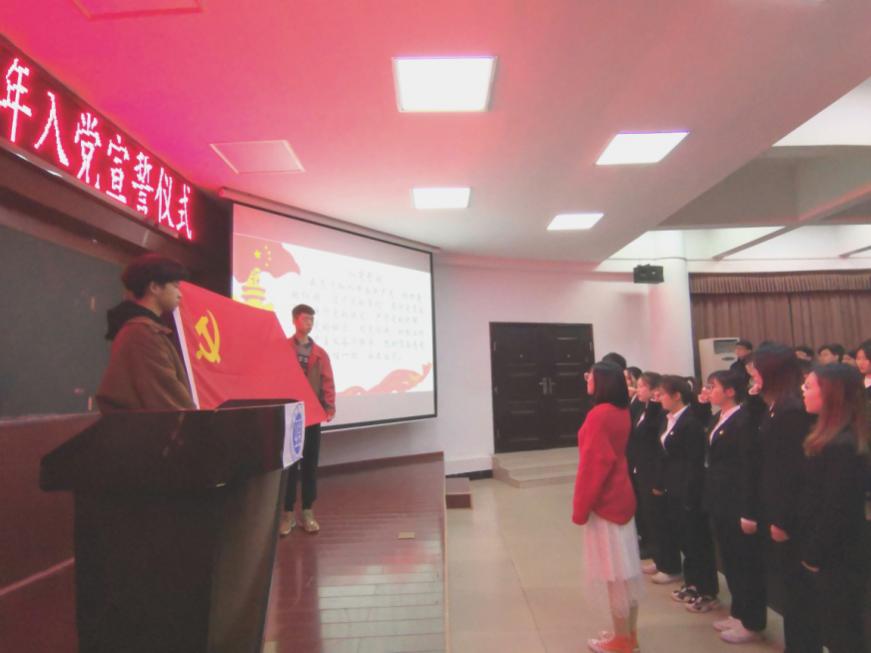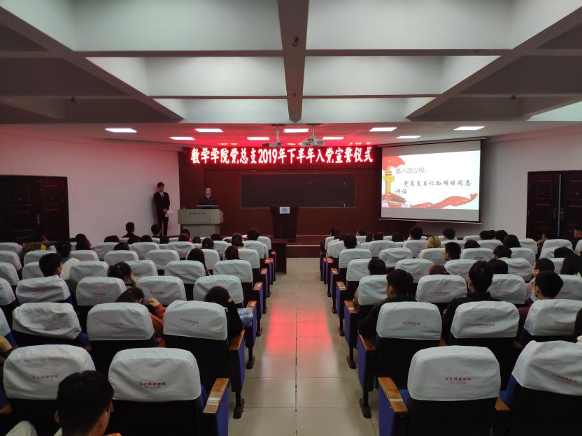 本站讯12月12日晚7:00,于6栋学术报告厅,数学学院党总支举行2019年下半年入党宣誓仪式。党总支书记孙明保同志,党总支副书记易政群同志出席,学生党支部、研究生党支部全体党员,18名新发展的党员,全体入党积极分子参加。