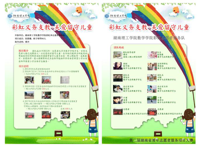 太阳成集团tyc151cc数学学院彩虹志愿者服务队成立于2015年,由国家二级心理咨询师傅丹老师进行指导,现任青年志愿服务中心主席粟琳涵为队长,带领干事和志愿者开展一系列以关爱留守儿童为主的志愿服务活动。