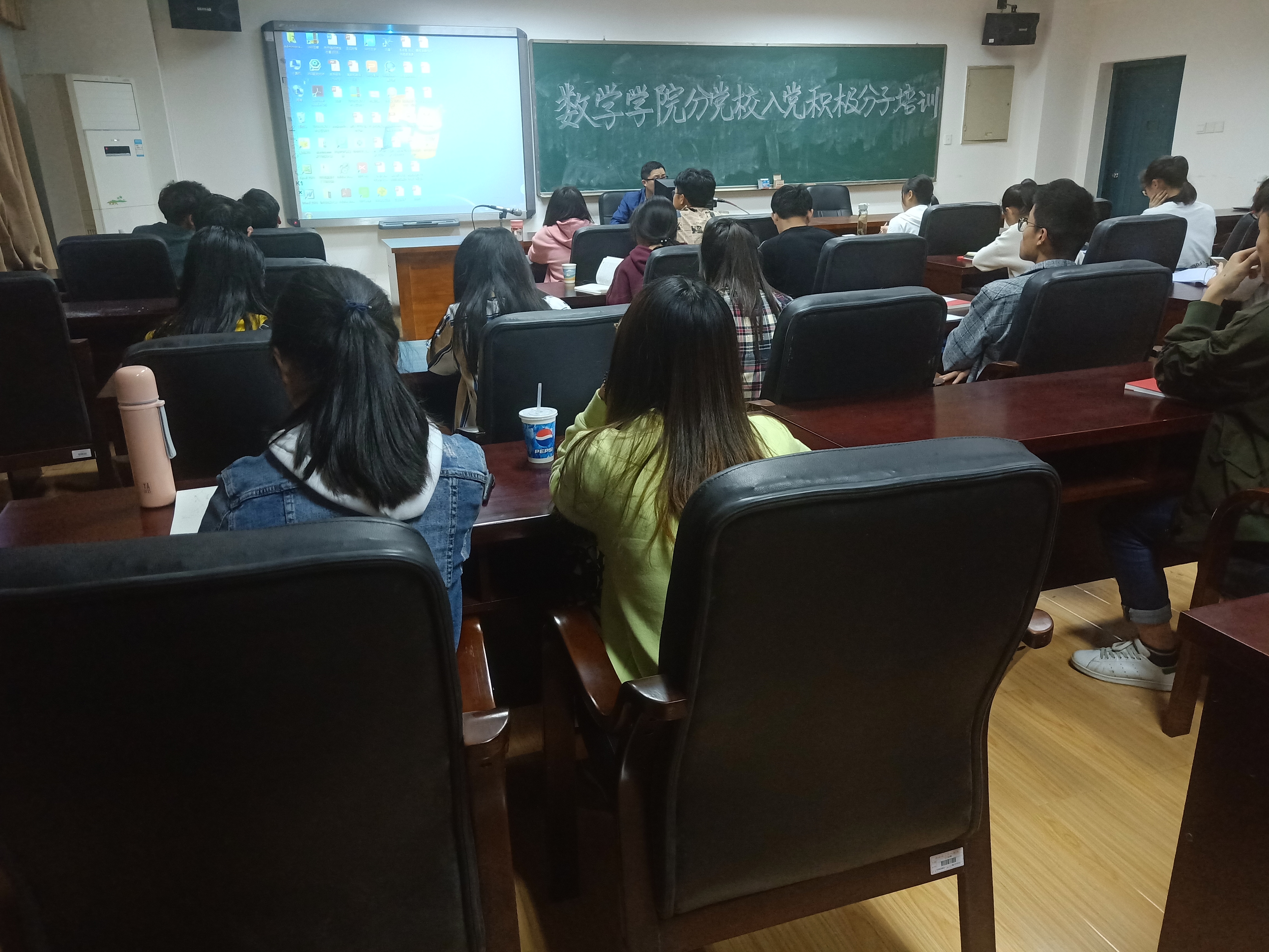 本站讯4月17日晚7点,数学学院在5511教室开展了本学期第三次入党积极分子培训,数学学院教工二支部书记何帆老师就“认真学习党章,严格遵守党章”对我院全体入党积极分子进行培训。