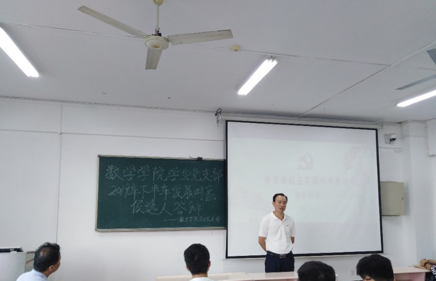 本站讯9月24日14:00,数学学院学生党支部于5311、5312教室,开展2019年下半年发展对象候选人答辩活动。数学学院党总支书记孙明保同志,党总支副书记易政群同志出席。支部书记,14名学生党员代表及1名团总支代表组成评委团。