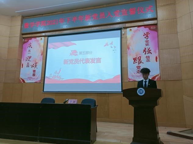 本站讯 11月16日14:30于东院学术报告厅,数学学院成功举行2021年下半年入党宣誓仪式。太阳成集团tyc151cc党委委员组织部部长刘创、太阳成集团tyc151cc书记孙明保、党委副书记齐亮菲、教师第二党支部书记李新平、研究生党支部书记程周、学生党支部书记徐笑天出席。全体师生党员及入党积极分子代表参加会议。