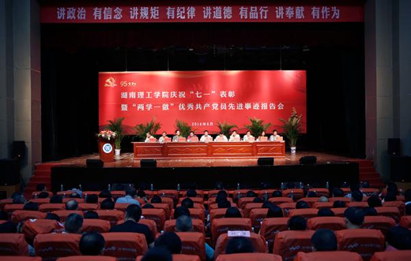 校园网讯 6月21日下午,在建党95周年之际,我校在东院演播厅召开庆祝“七一”表彰暨“两学一做”优秀共产党员先进事迹报告会。全体在家校领导、退休的副厅级老领导、受表彰的共产党员标兵、优秀共产党员、优秀党务工作者、全校副科以上干部、教工支部书记、学生支部书记、组织员、党务部门全体工作人员、党员代表等出席报告会。