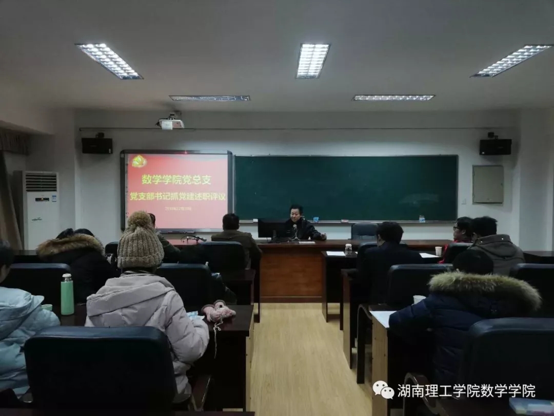 本站讯12月28日晚,数学学院党总支在5511教室举行党支部书记抓党建述职评议。数学学院党总支书记孙明保,党总支副书记易政群,总支委员江五元、李松华,教工一支部书记罗德仁、教工二支部书记何帆、研究生支部书记张再云、学生一支部书记傅丹、学生二支部书记何铁勇出席,六名学生党员参加此次会议。