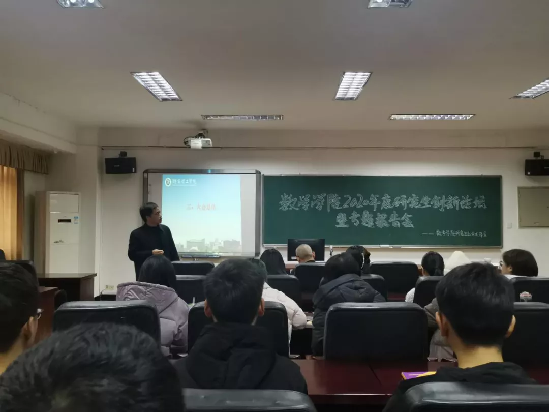 第三项,江五元院长与余德民副教授对汇报同学做点评,首先余德民副教授分别就三位同学的专题报告提出意见,在指出研究方向特色的同时也针对报告中存在的问题和不足给予改正建议。然后江五元院长提到本次是数学学院第一次以分论坛的形式举行创新论坛活动,论坛应充分体现“创新”“发展”的精神,希望数学学院研究生们自立自强,提高学习的主动性与创造性,积极参与到这样的创新活动中来,不断充实、发展自己,并且对研究生的未来发展寄予了美好祝愿。最后经讨论决定,推荐李笛同学参加校级研究生创新论坛活动。