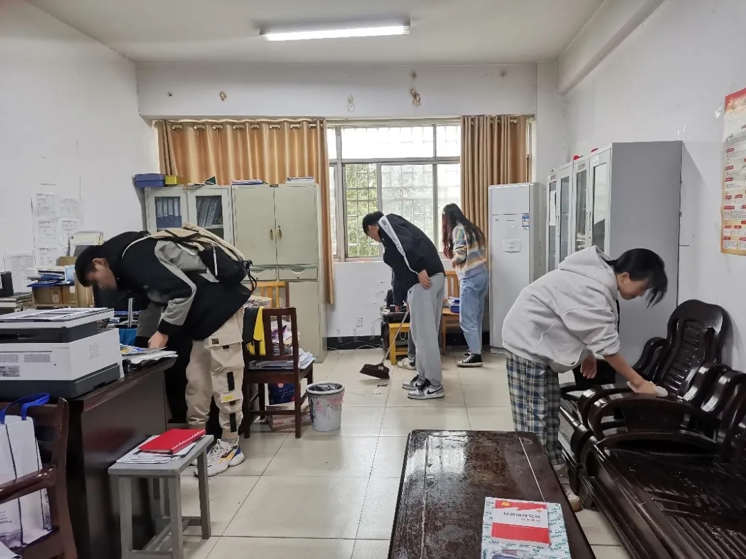 活动开始前,全体党员在五号教学楼一楼大厅集合,纪检工作室成员进行人员点到,并对党员进行活动分组。随后,各组人员根据工作任务,对教学楼内各类宣传栏、楼梯扶手、楼道间杂物、教室课桌椅、地板污渍等进行清理。活动过程中,党员们各司其职,互帮互助,认真积极地对待每一处活动区域的清扫。