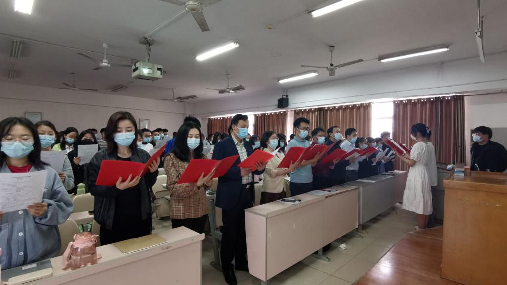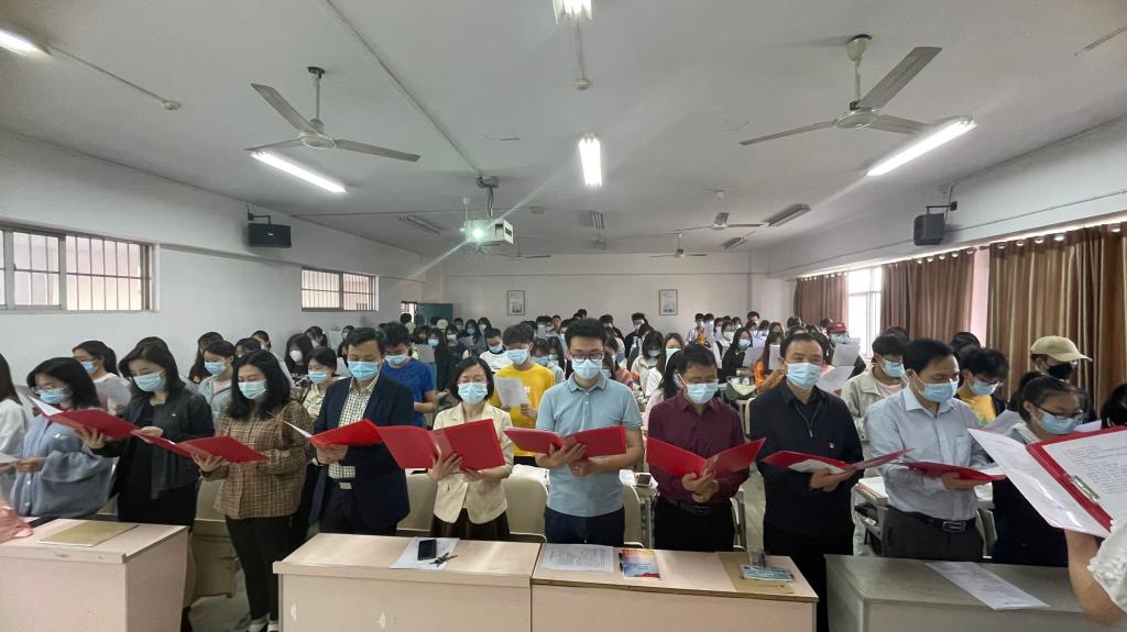 本站讯 为庆祝建团 100 周年,喜迎党的二十大胜利召开,进一步加强大学生爱国主义教育,培育大学生家国情怀,增强大学生文化自信,促进优良学风校风建设。在五四青年节来临之际数学学院开展“青春献礼二十大,强国有我新征程——大学生课前三分钟爱国朗读(第五季)”活动启动仪式。党委学工部副部长毛伟、心健中心主任李一飞、太阳成集团tyc151cc书记孙明保、院长周小强、副书记齐亮菲、副院长李松华、副院长黎丽梅、副院长罗德仁与学生一起朗诵经典篇目《少年中国说》。
