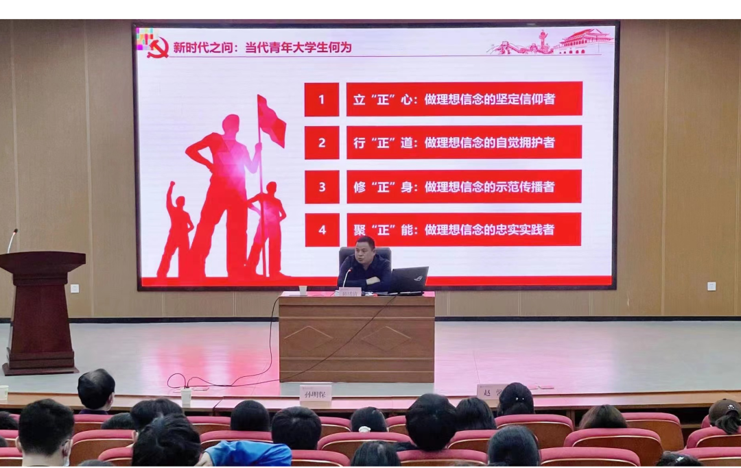 讲座伊始,陈绪清对何为新时代进行了诠释,进而引出新时代之问——当代大学生应该有何作为?并提出了新时代青年应具备立正心、行正道、修正身、聚正能的优良品质。随即,陈绪清又强调了新时代大学生应紧随马克思主义和共产主义引领,形成具有新时代中国特色社会主义的理想信念。陈绪清阐述了当代大学生在理想信念方面存在的普遍性问题,指出了西方错误观念是对当代大学生理想信念的侵蚀,并立足于新时代的大背景视角,为同学们提出了建设性的问题解决措施,希望同学们都能成为“眼中有光,脚下有路,心中有梦”的新时代青年。讲座最后,孙明保对全体新生提出“五有”要求:一是要有道德情操,热爱身边的人;二是要有理想目标,坚定不移地去奋斗;三是要有专业知识,努力学习好每门课程;四是要有拼搏精神,不畏艰难困苦,努力攀登;五是要有强健的身体,健康快乐地度过大学生活。